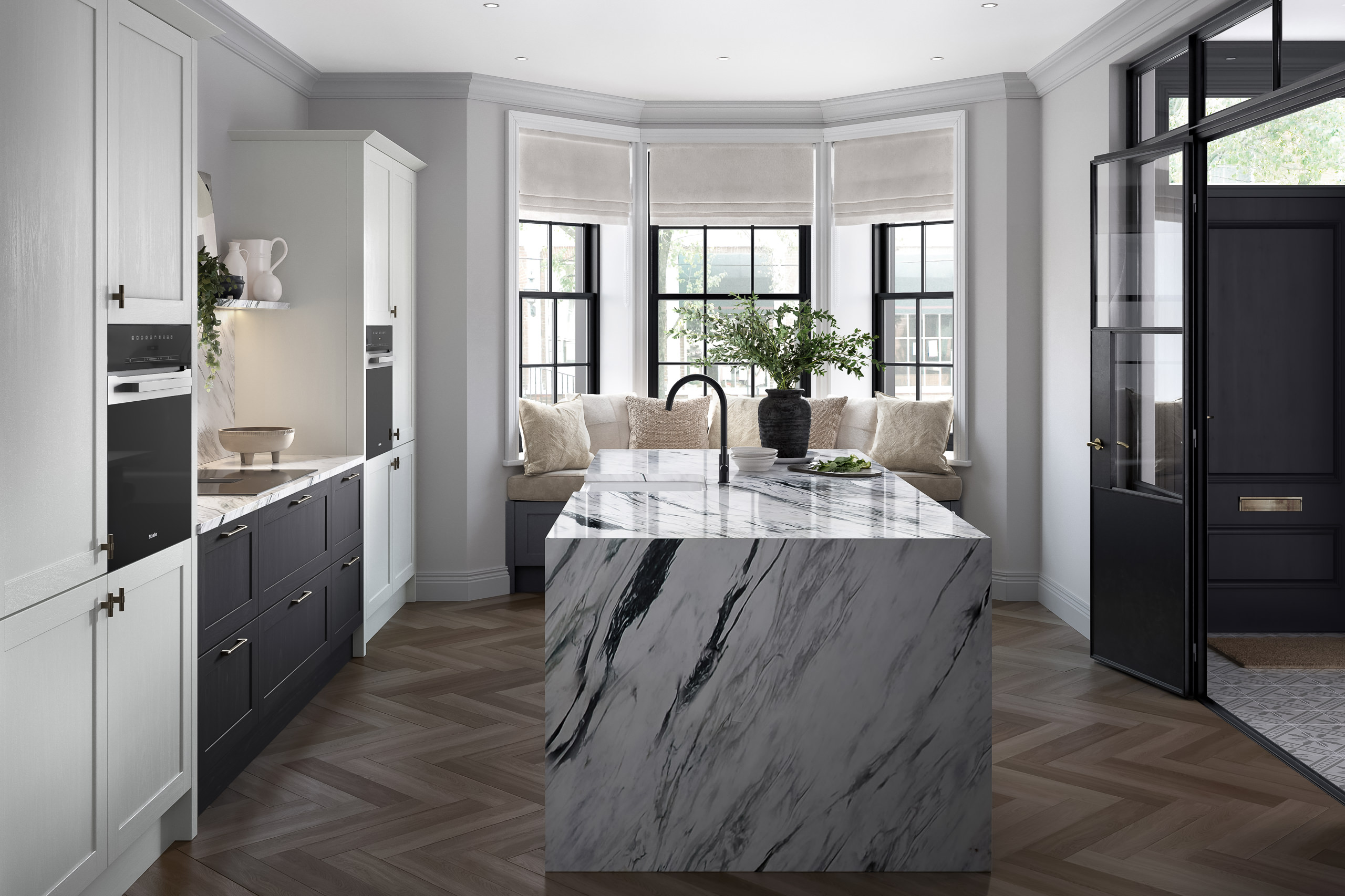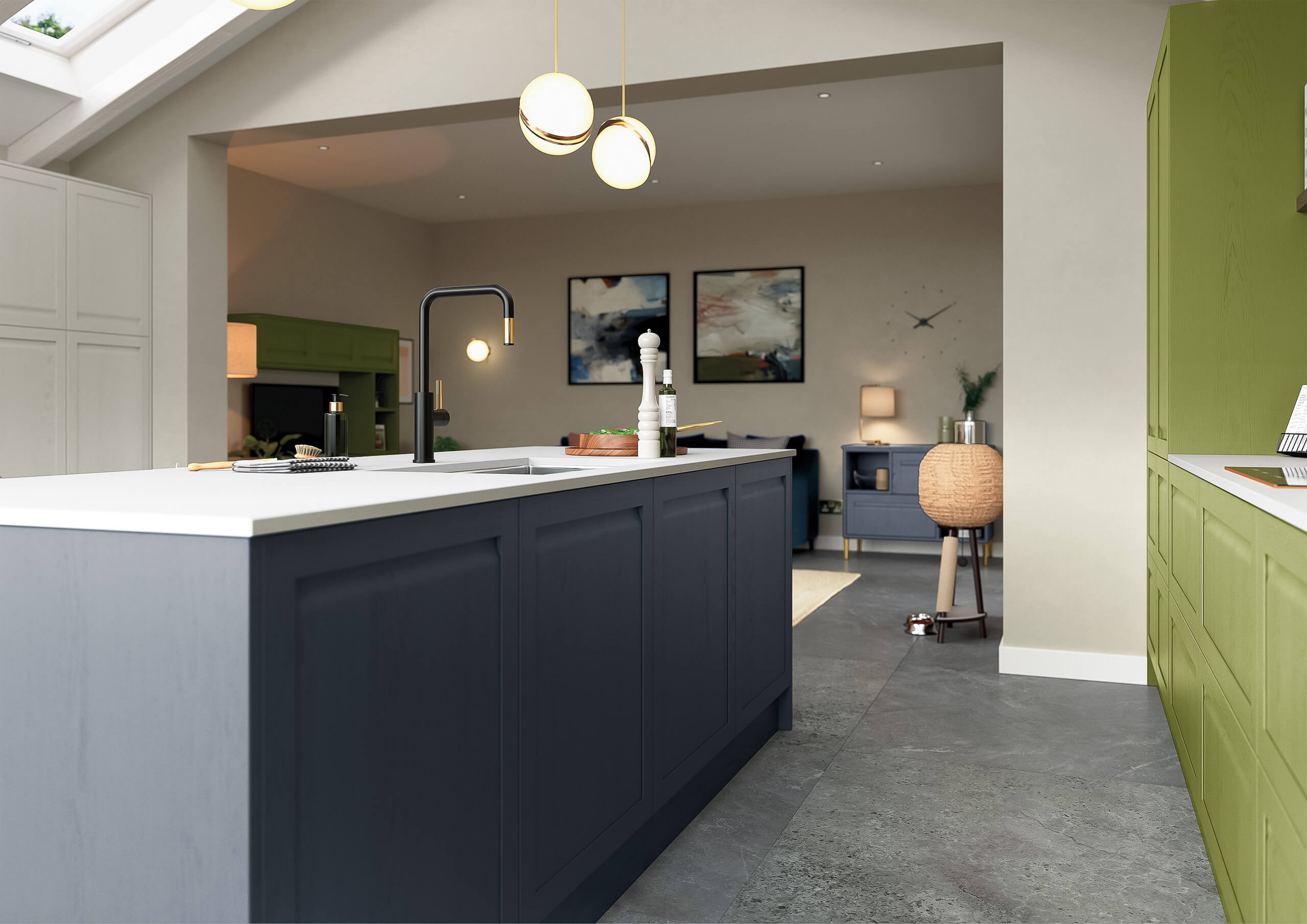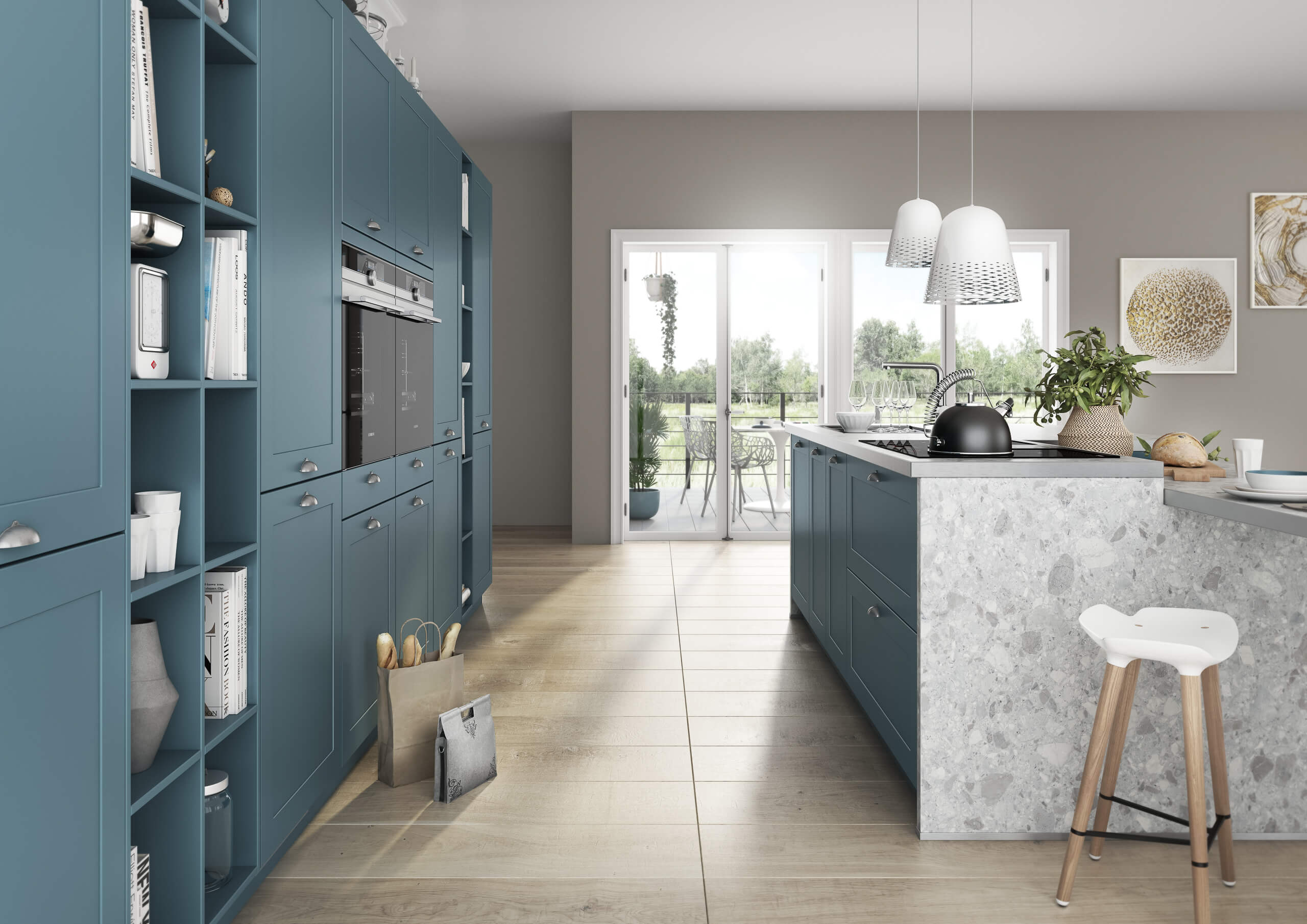 A modern kitchen with fjord blue and concrete grey, clean lines, marble-effect surfaces, and integrated appliances for practicality and charm.