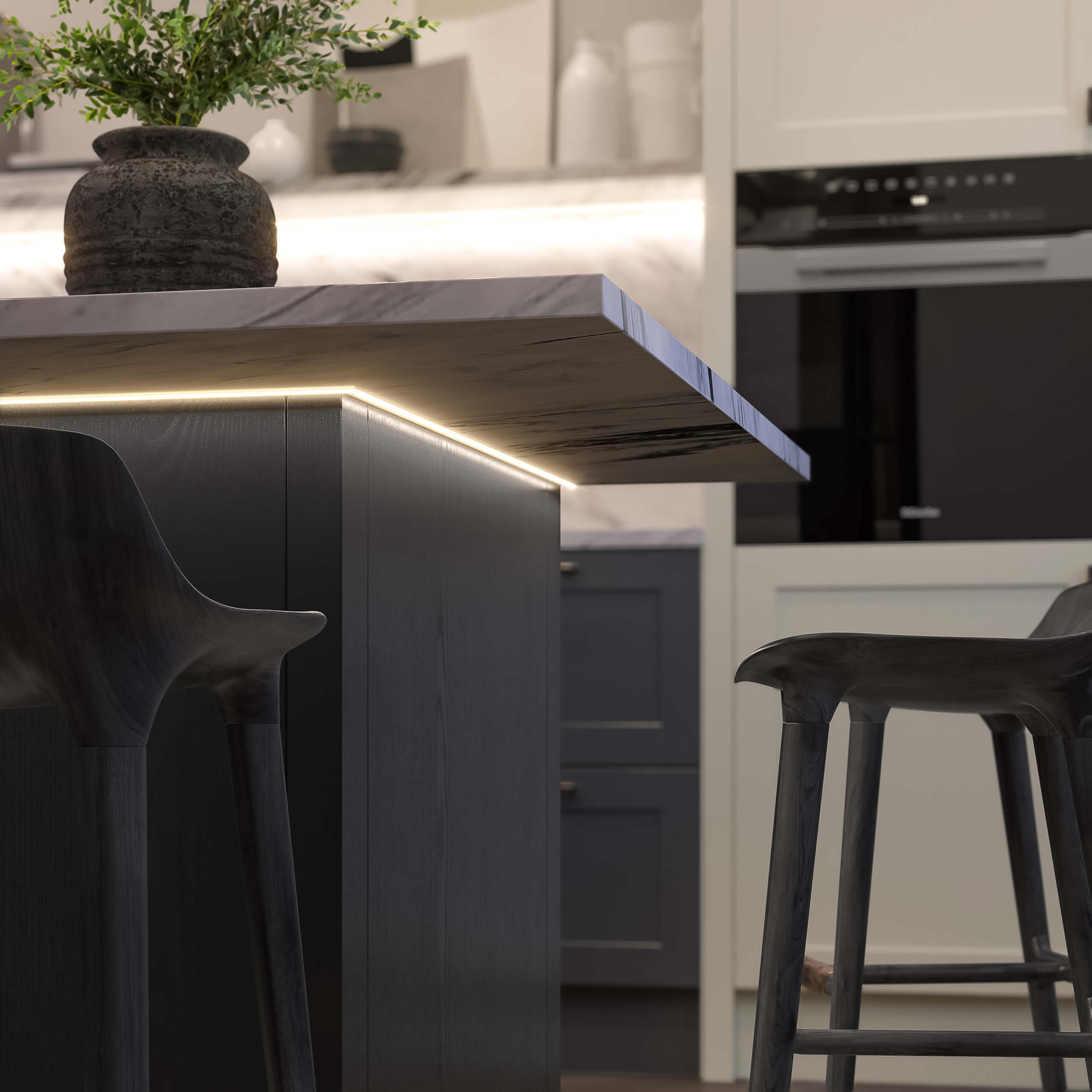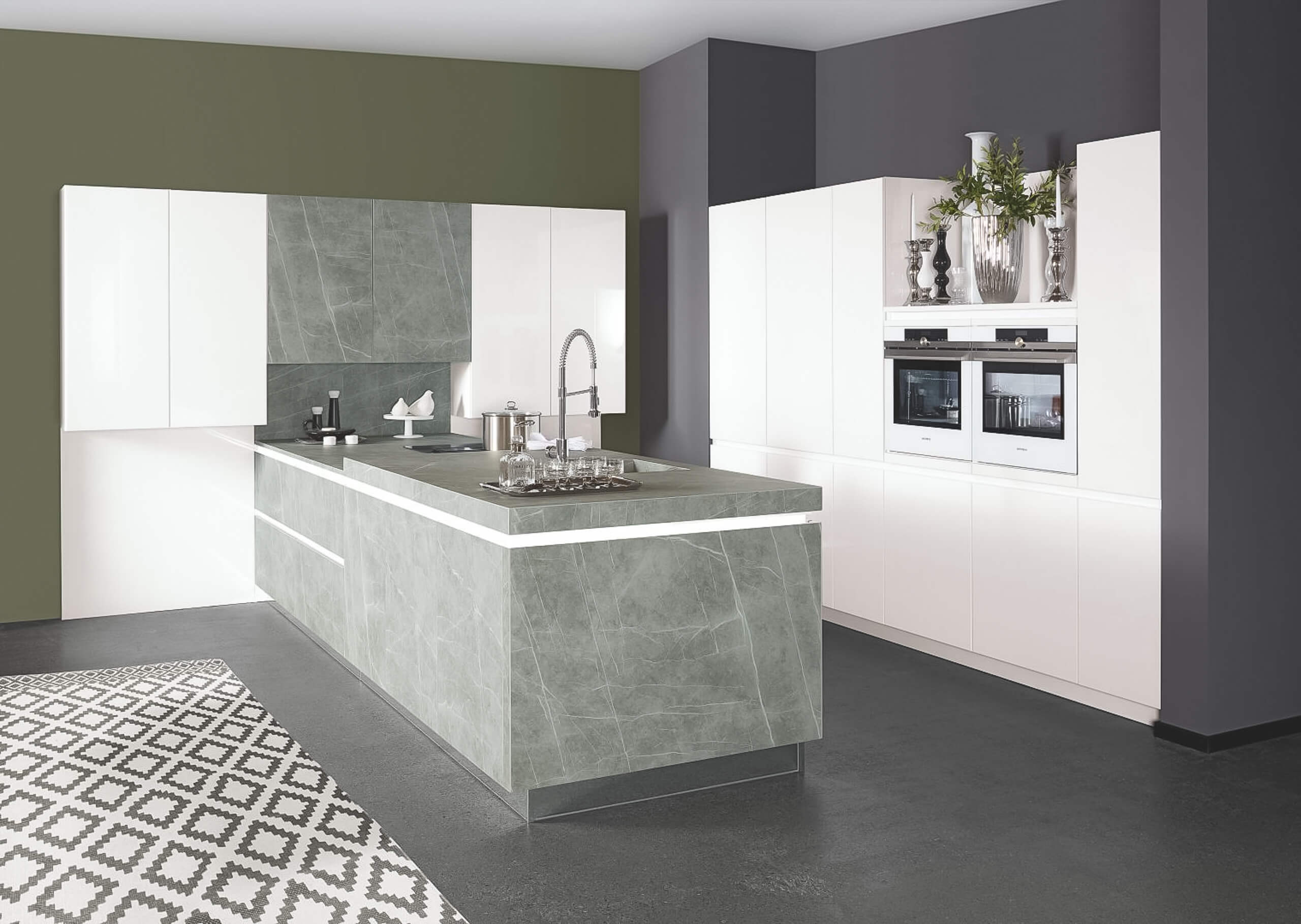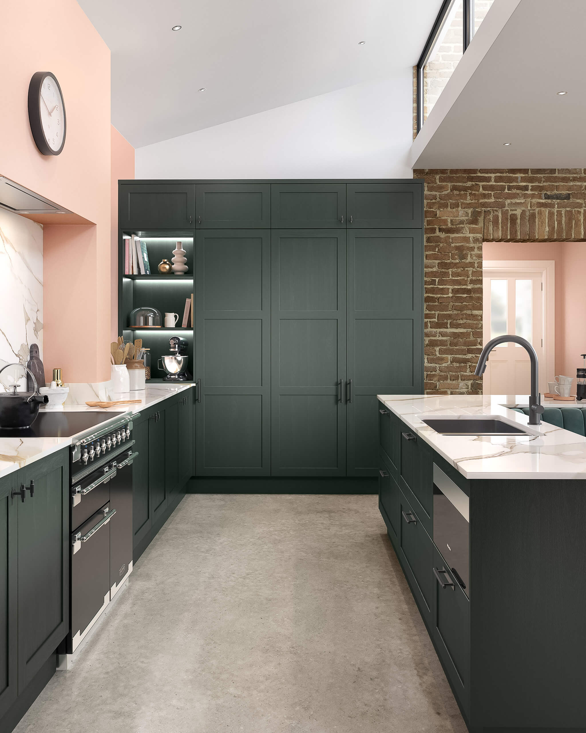 A modern kitchen with fjord blue and concrete grey, clean lines, marble-effect surfaces, and integrated appliances for practicality and charm.