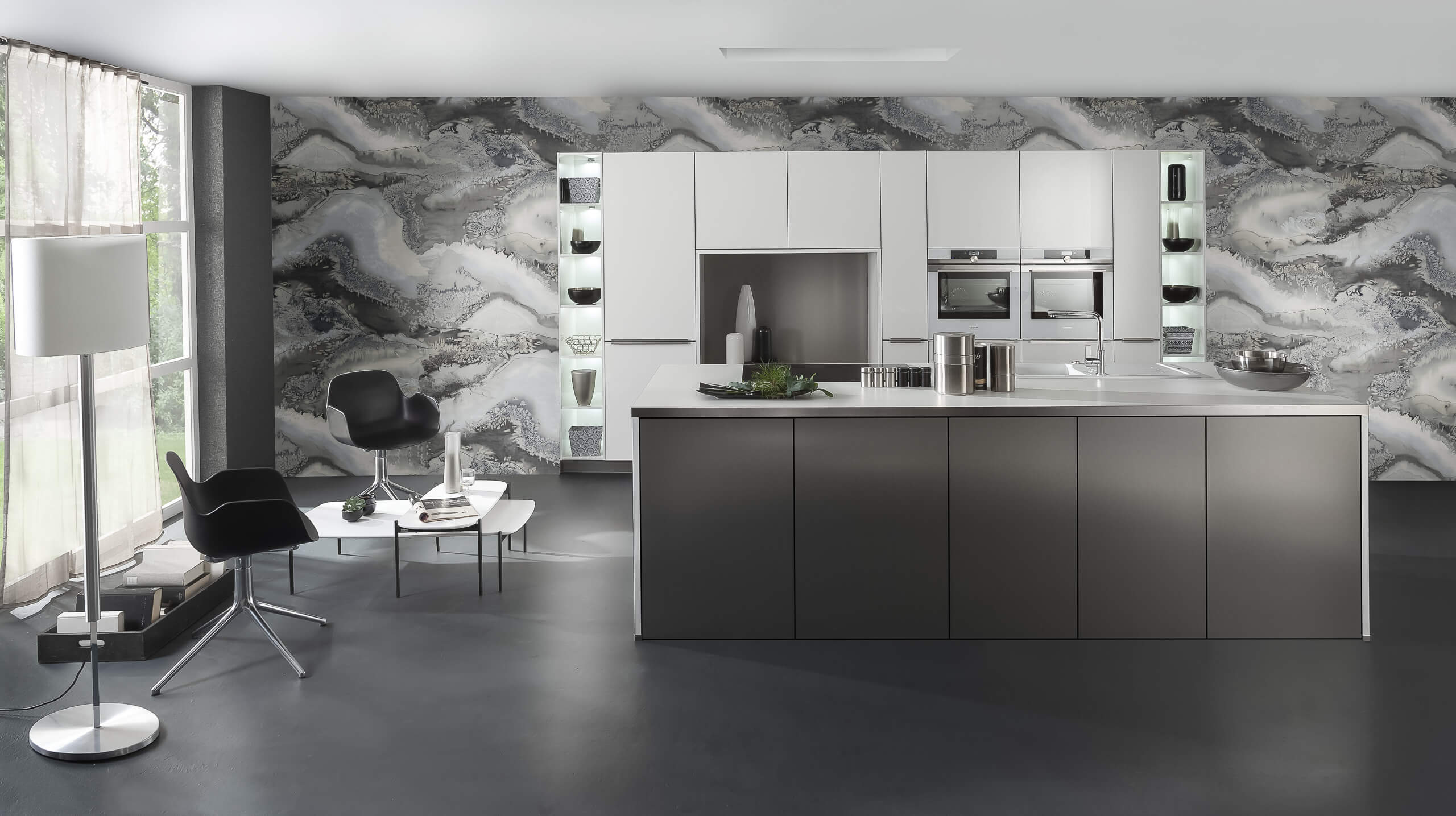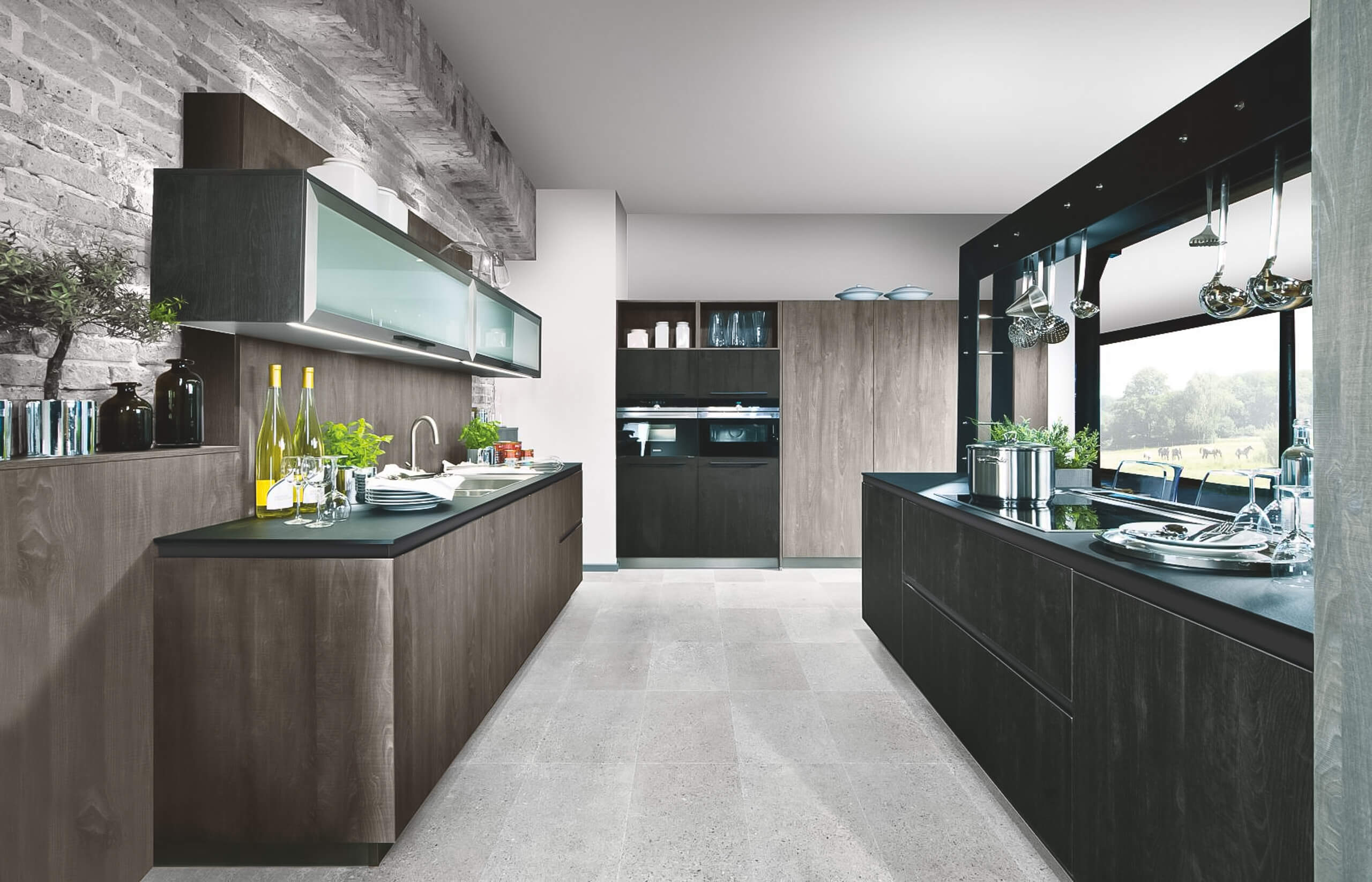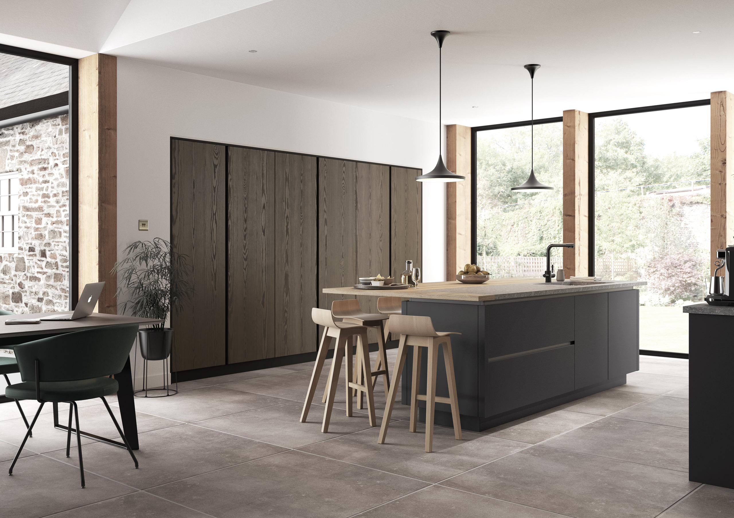 A modern kitchen with garden views, combining sleek design, natural elements, and seamless indoor-outdoor living for a striking centerpiece.