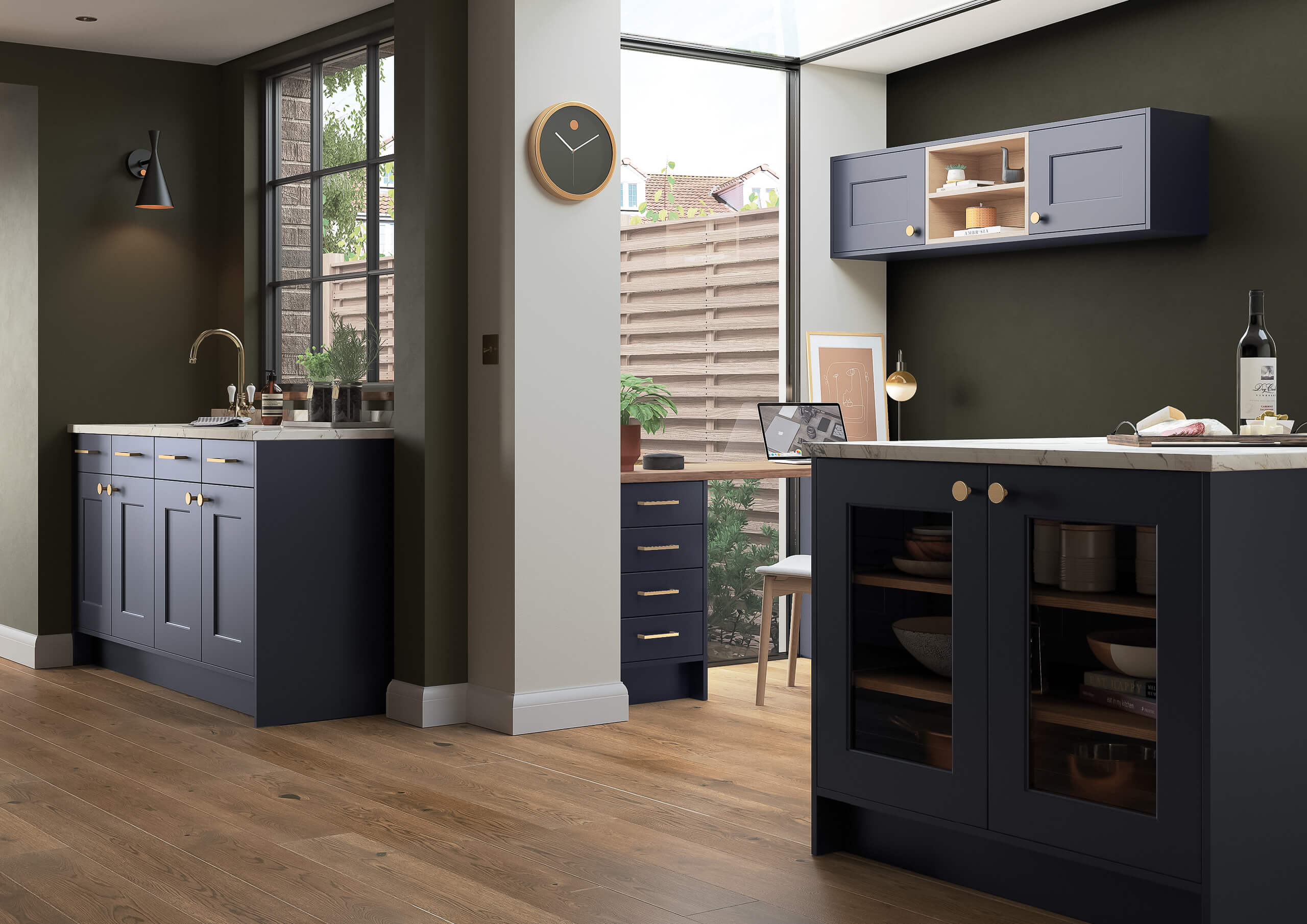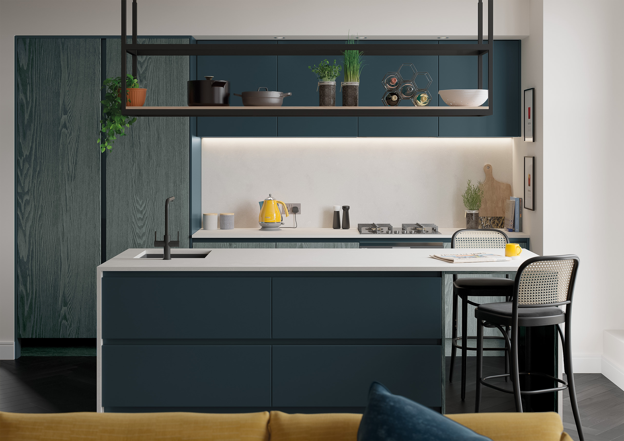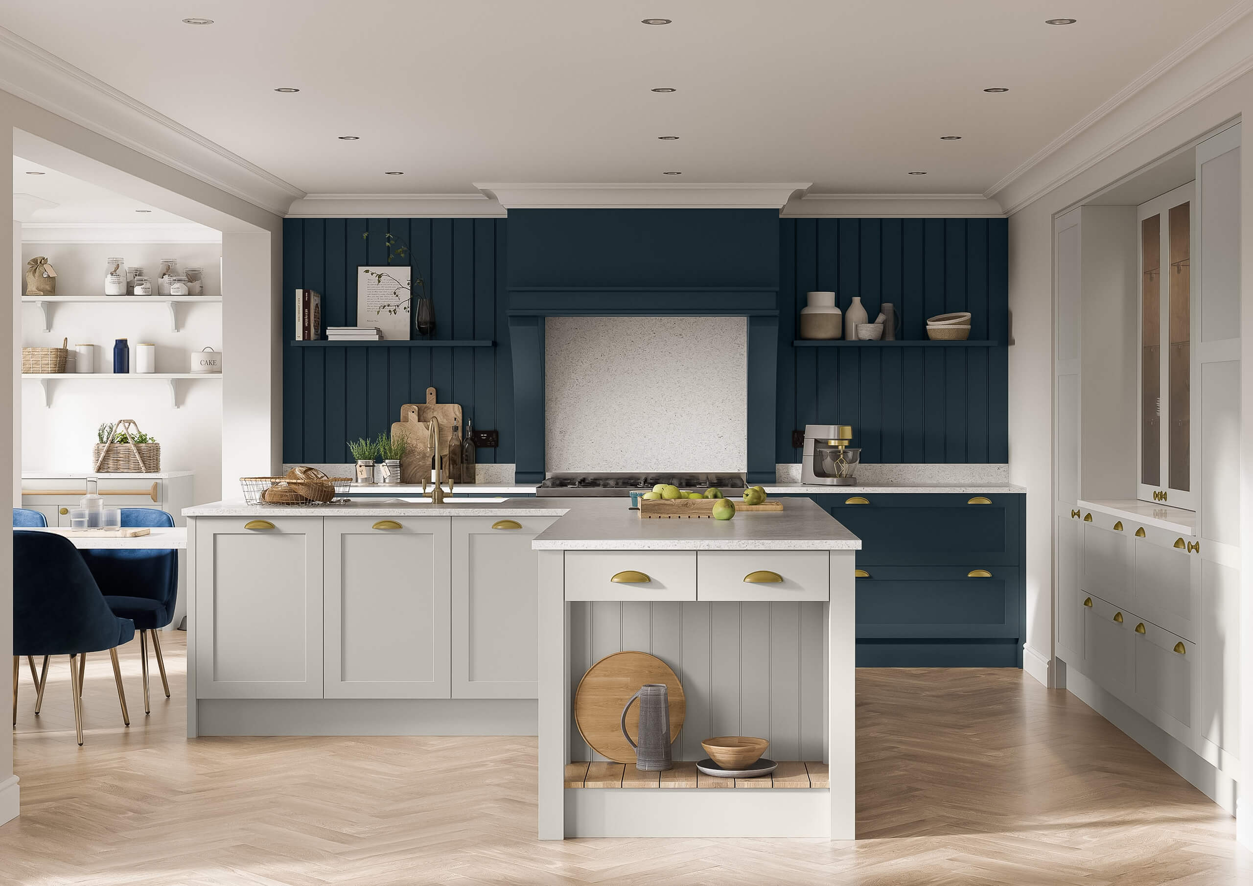 A contemporary blue kitchen with tall units offering ample storage, a central island perfect for socialising, and an efficient L-shaped sink layout for seamless workflow.