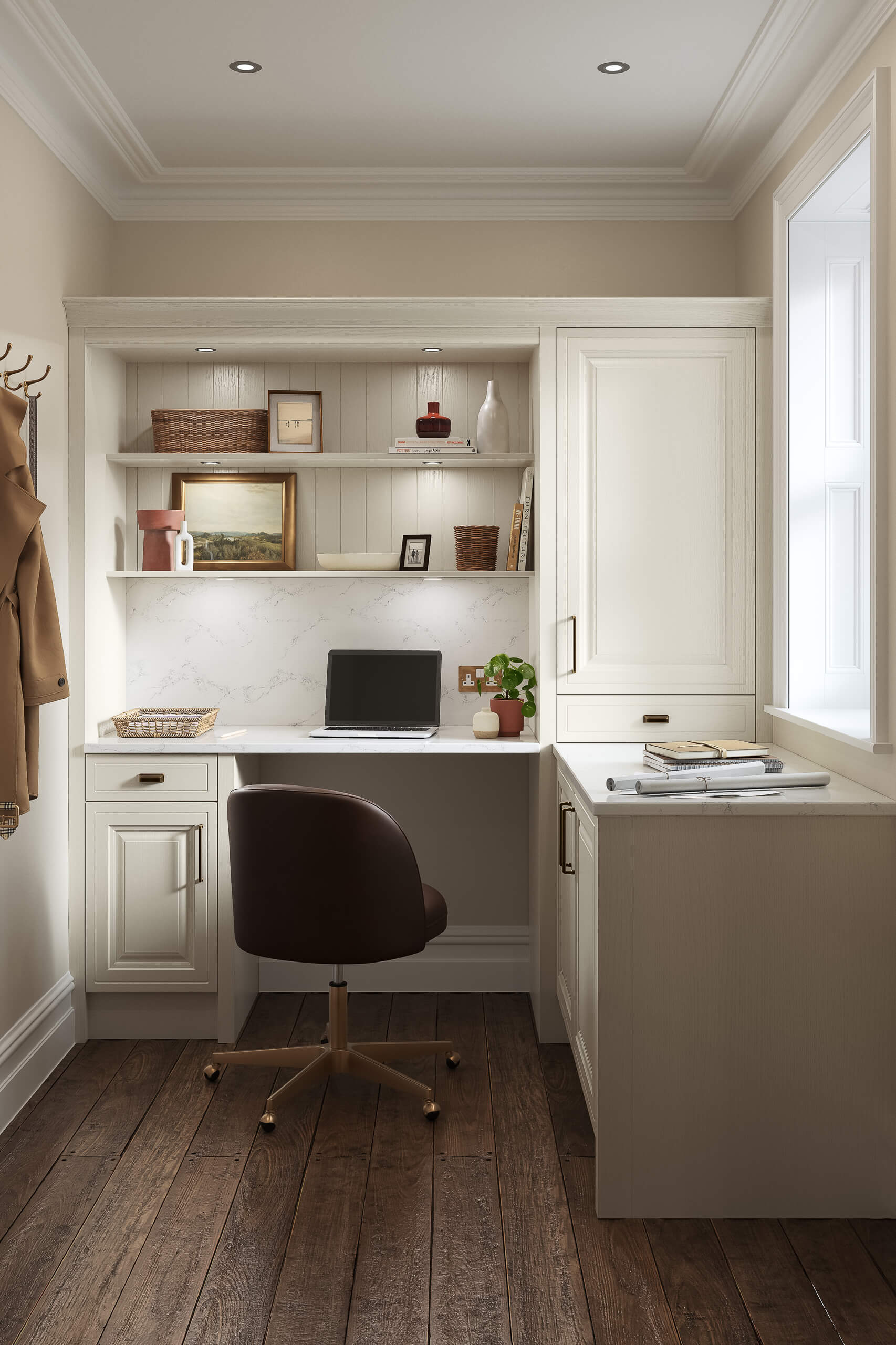 A timeless galley kitchen with pastel cabinetry, brass accents, marble-look countertops, open shelving, and warm under-shelf lighting.