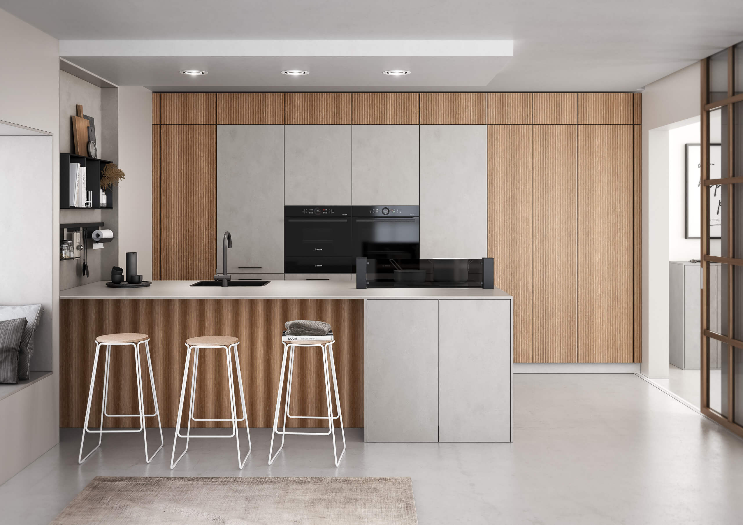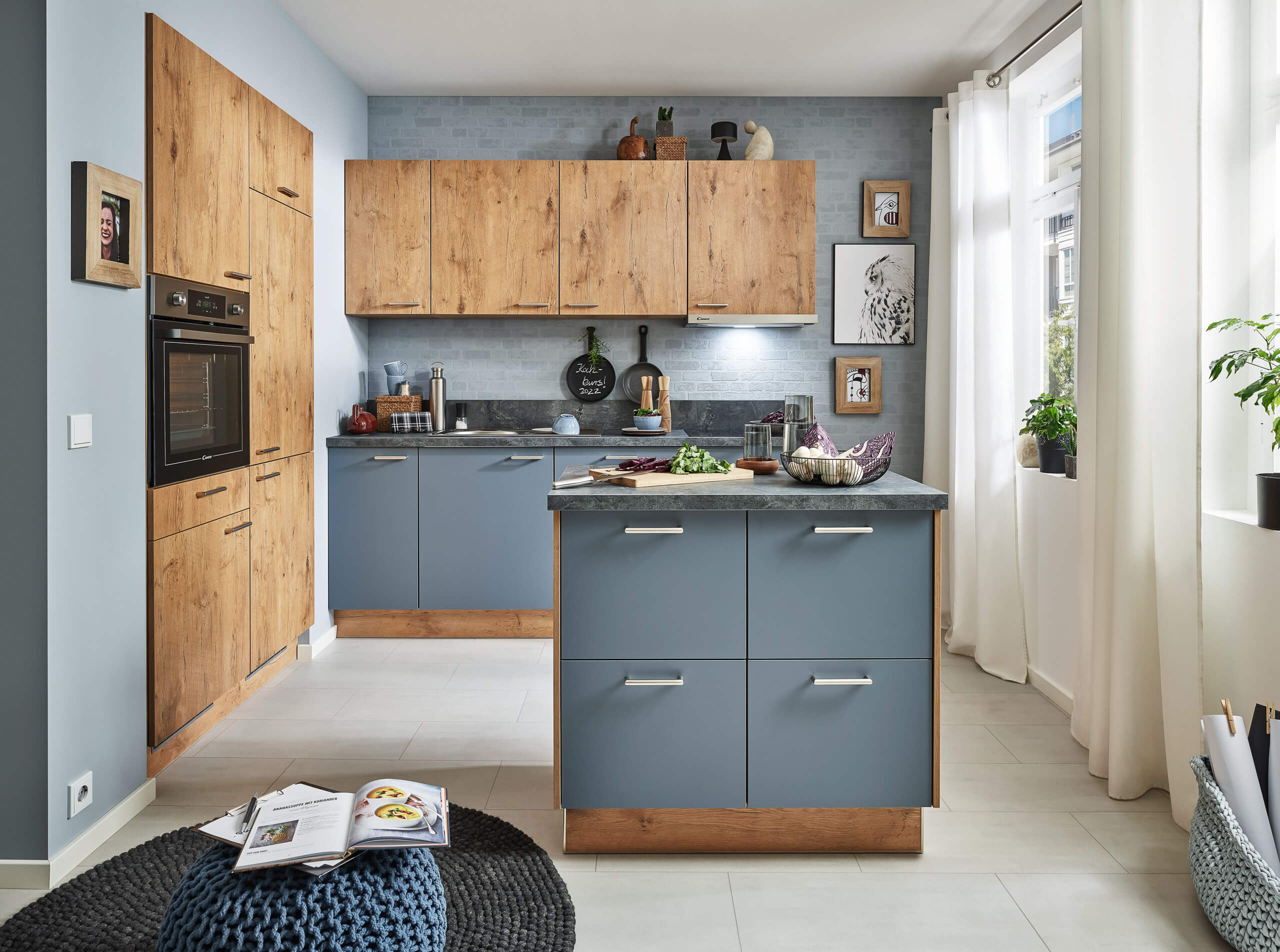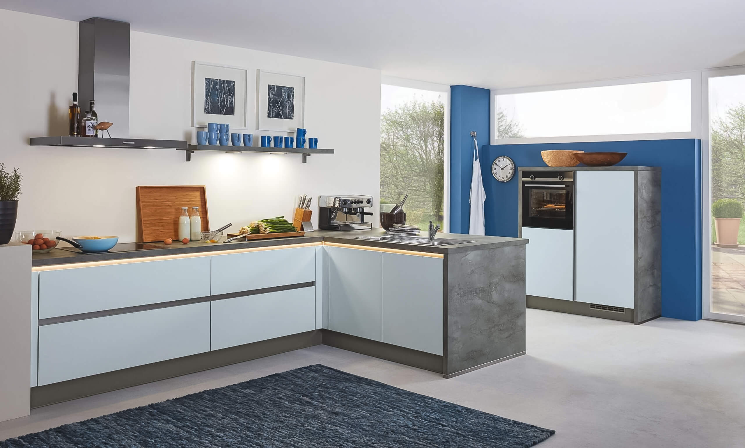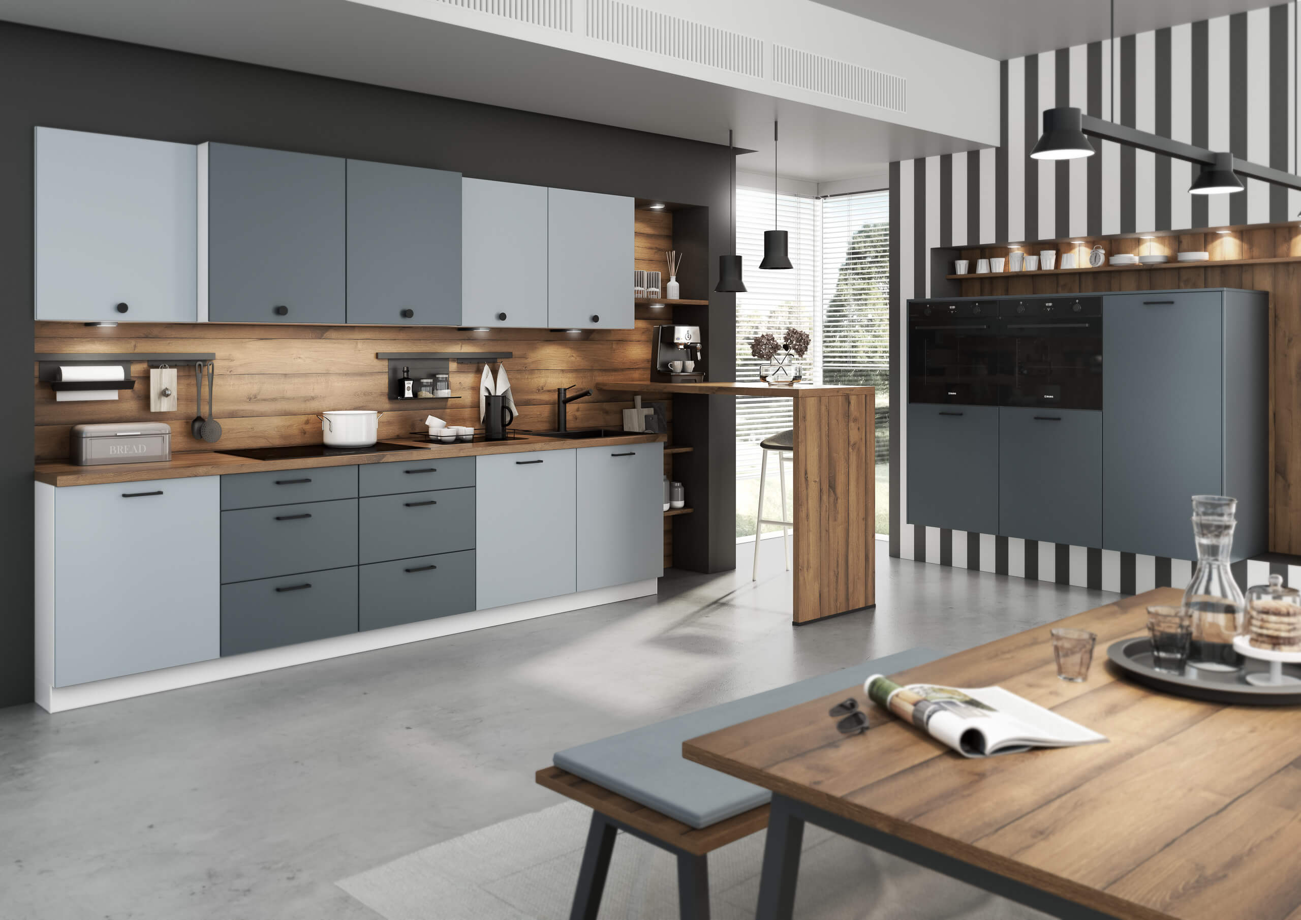 A modern kitchen with fjord blue and concrete grey, clean lines, marble-effect surfaces, and integrated appliances for practicality and charm.