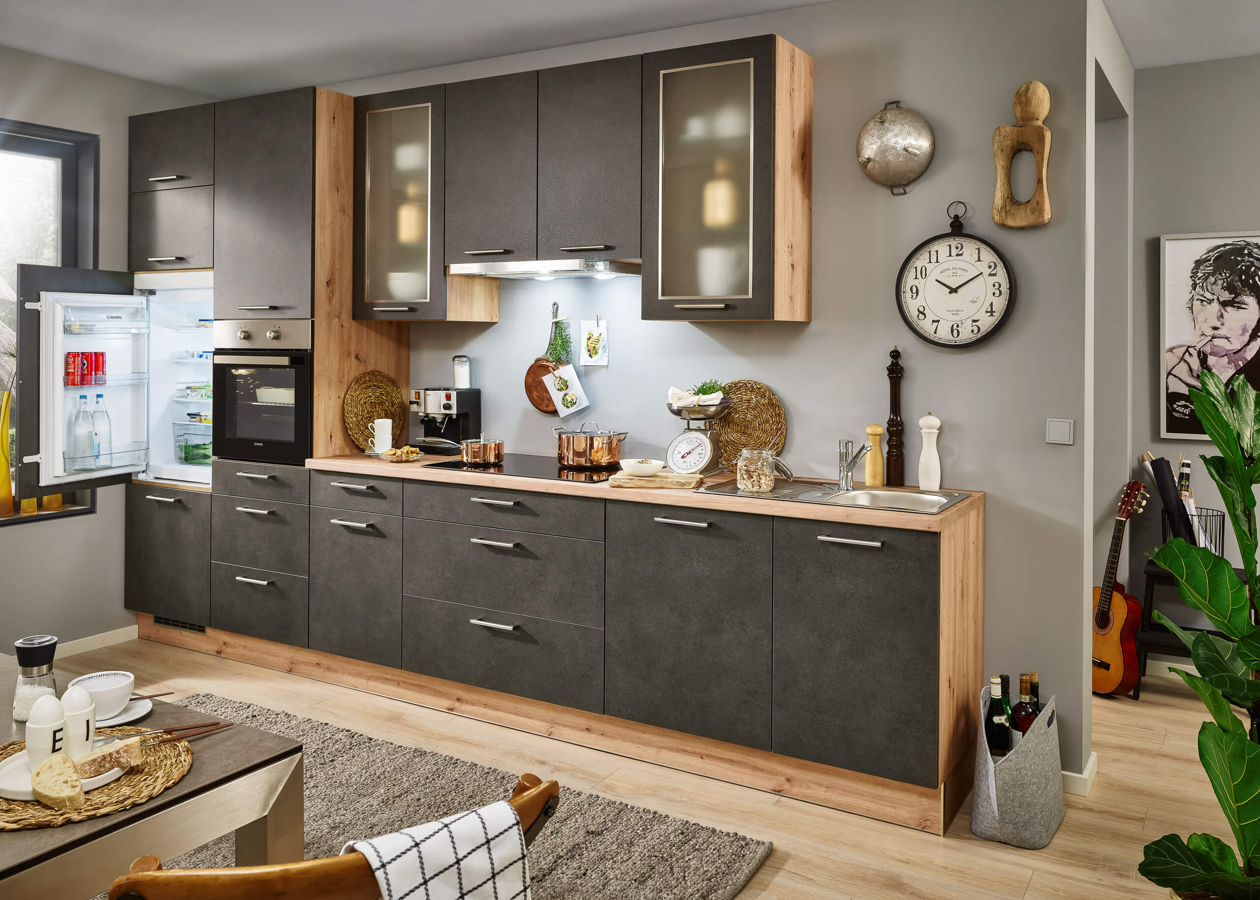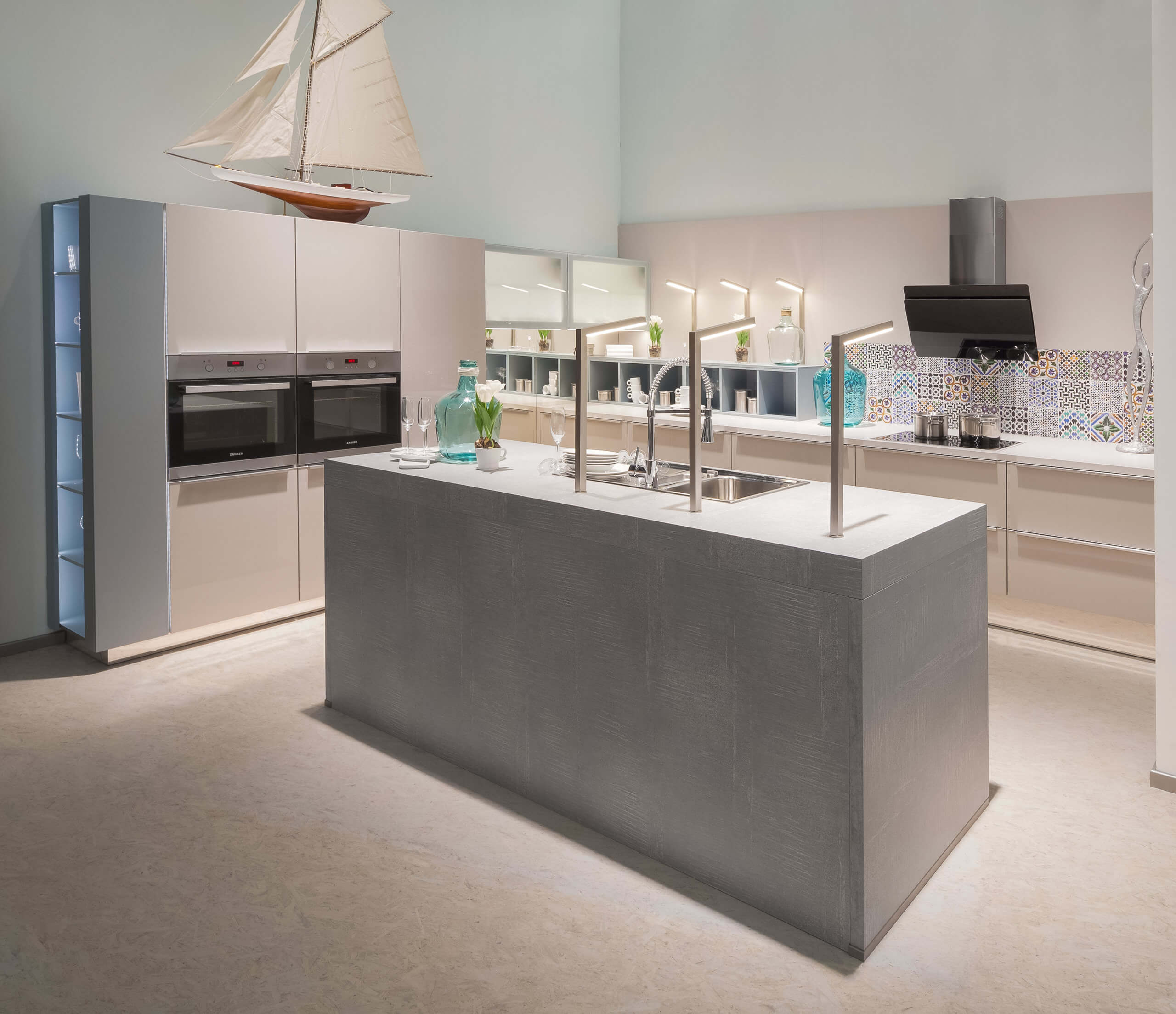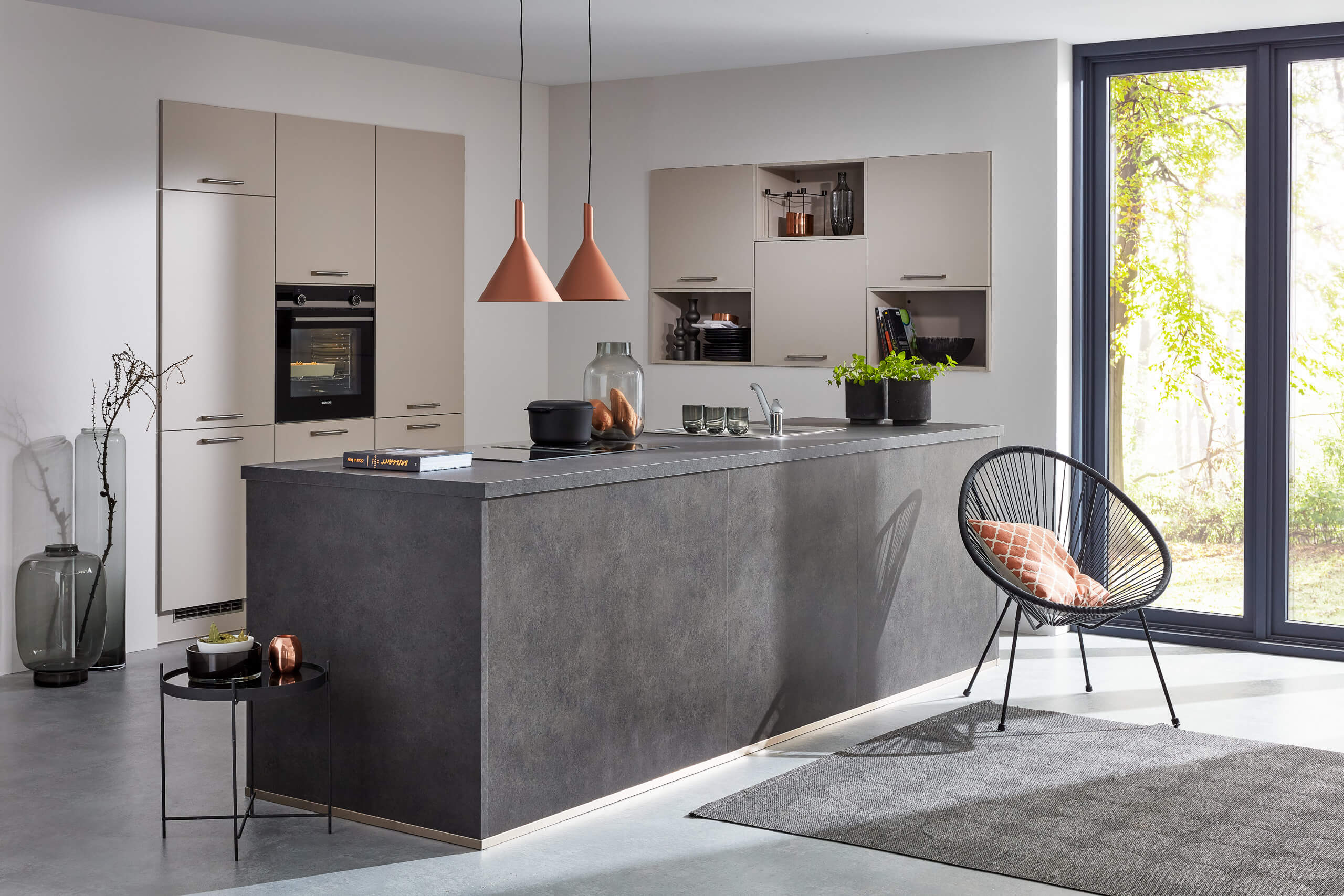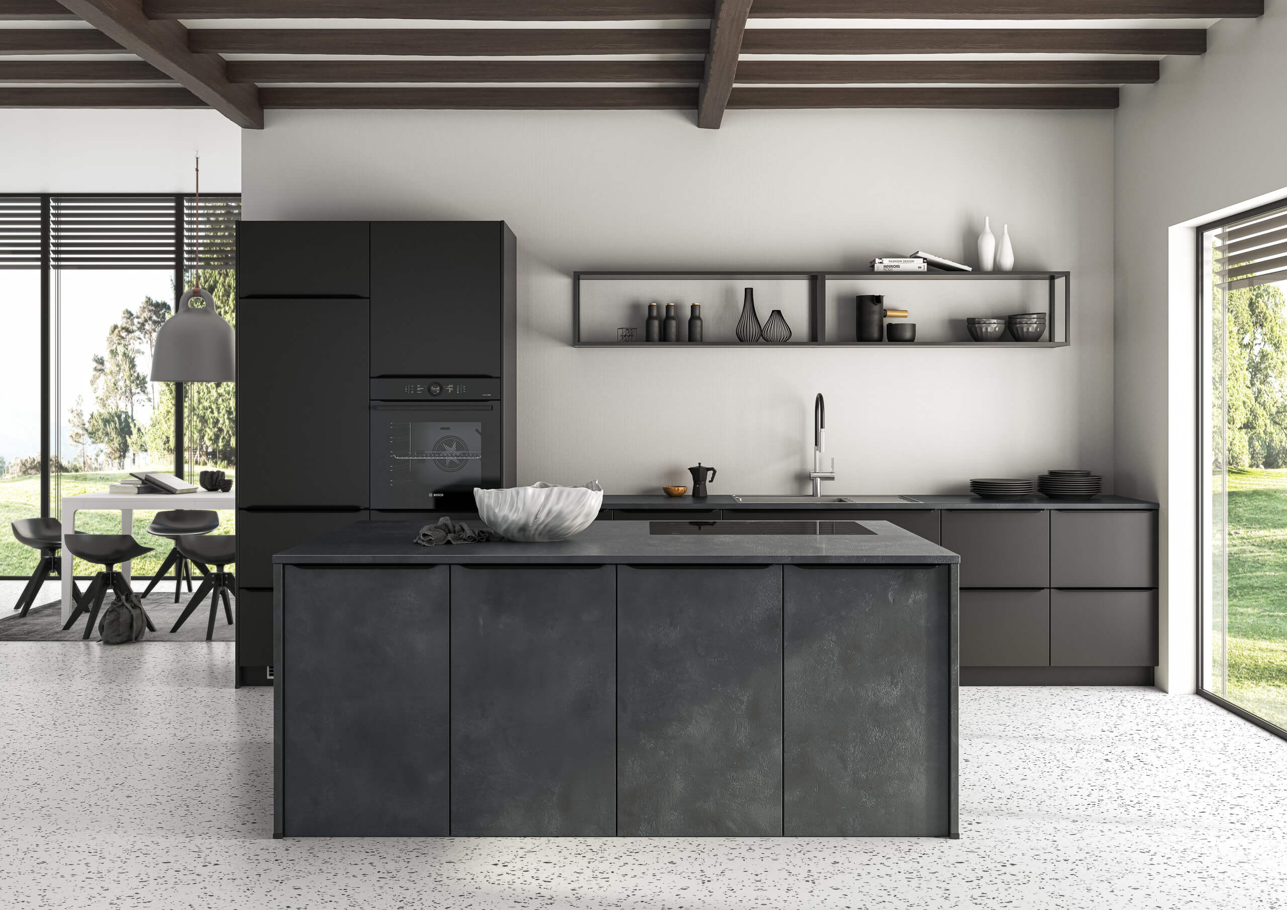 A modern kitchen with fjord blue and concrete grey, clean lines, marble-effect surfaces, and integrated appliances for practicality and charm.
