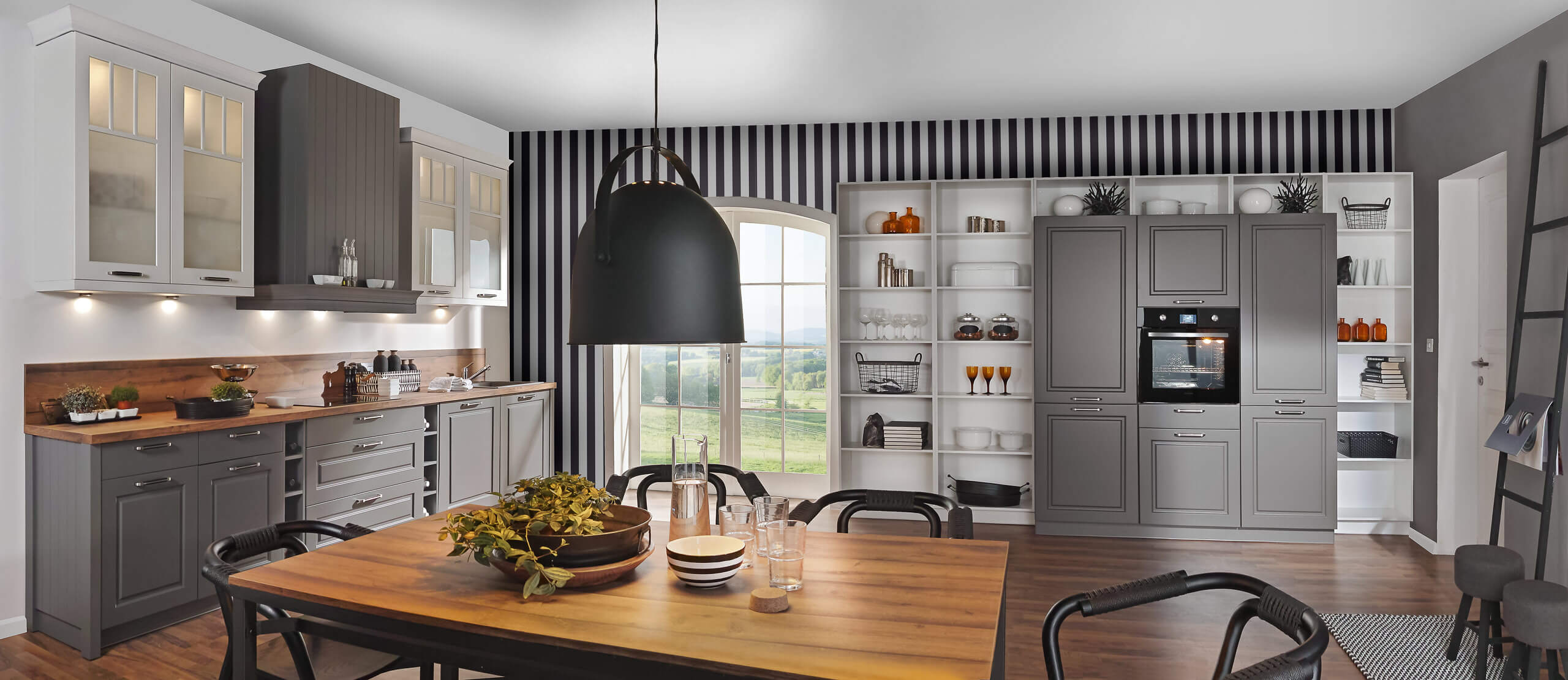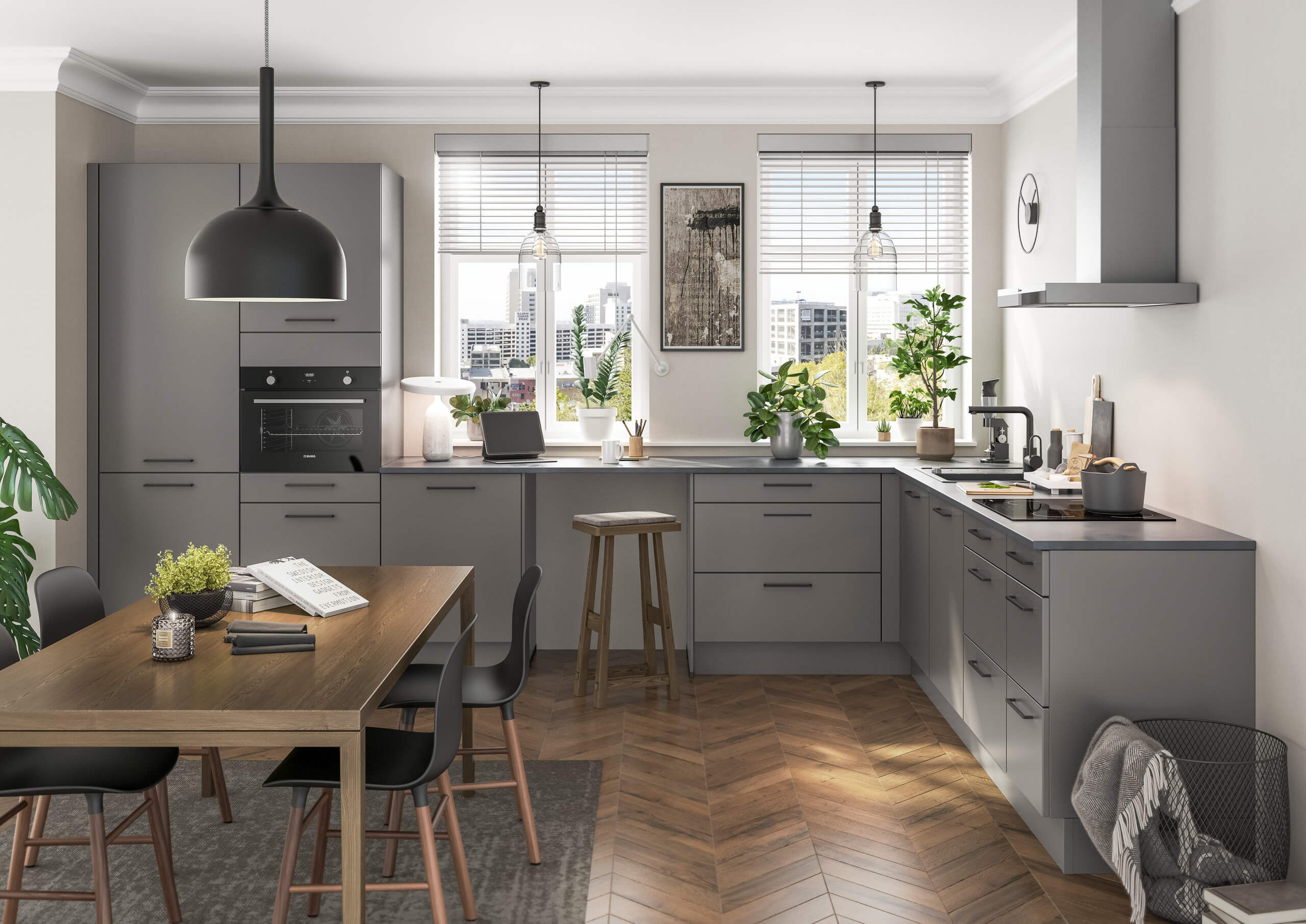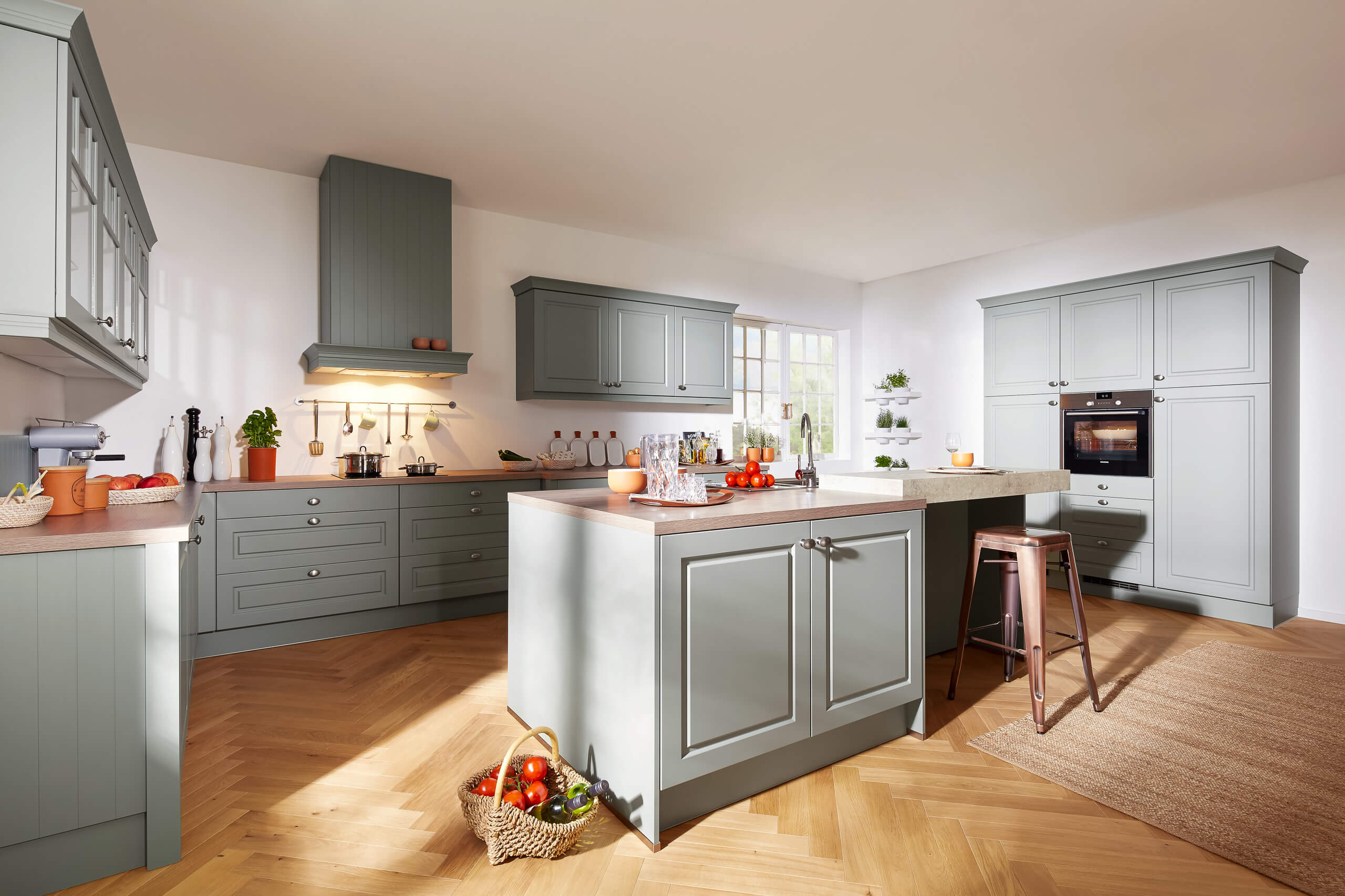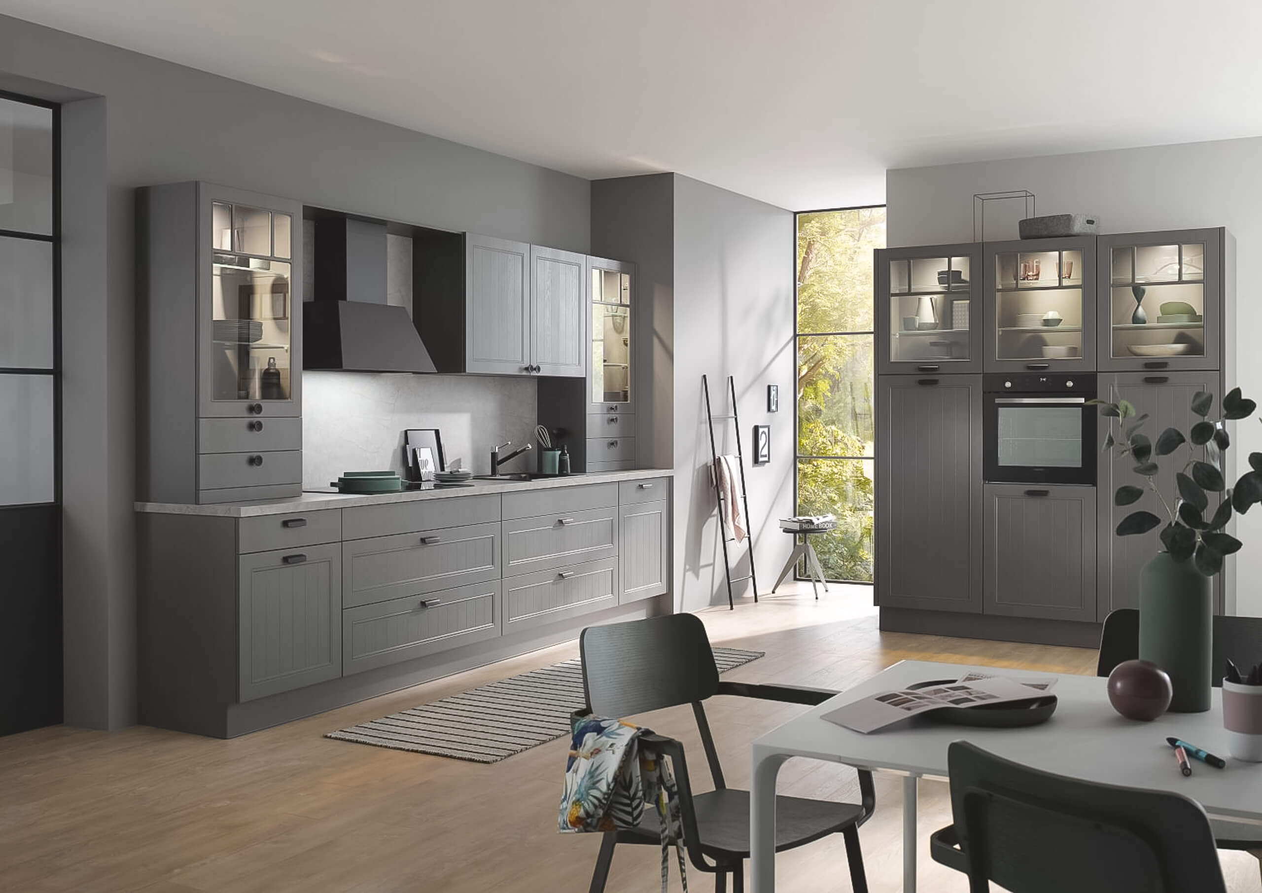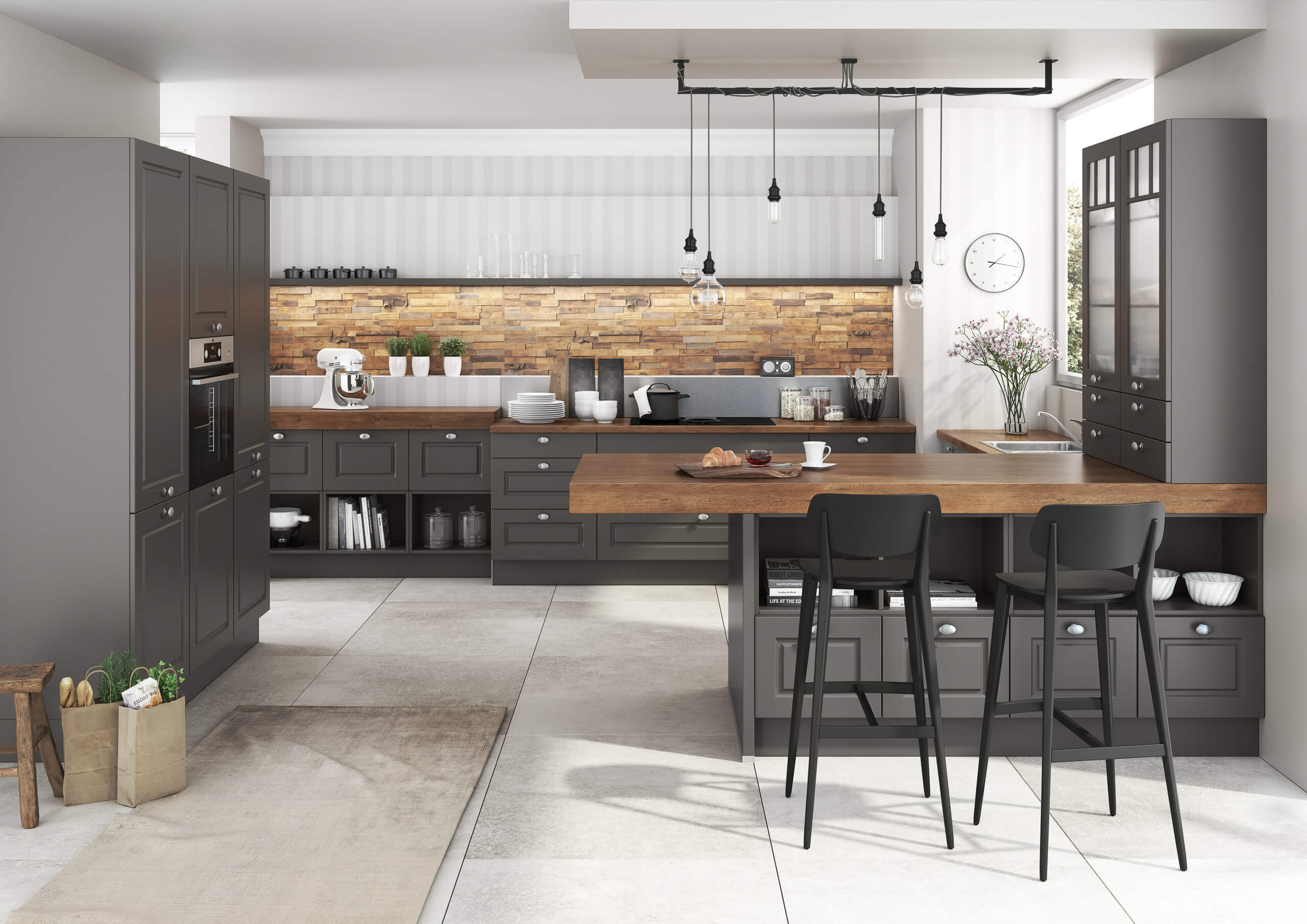A timeless shaker kitchen in slate grey, blending traditional charm with modern touches and a welcoming, sophisticated ambiance.